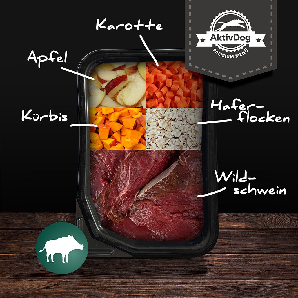 AktivDog Wildschwein mit Haferflocken ist ein energiereiches Futter mit einem Fleischanteil von 54 %. Es ist ein bekömmliches Alleinfuttermittel, welches für Hunde jeden Alters geeignet ist. Kombiniert wird das Menü mit Haferflocken, Apfel, Kürbis, und Karotte. Der hohe Energiewert gewinnt das Menü durch die Zugabe der Haferflocken. Die schonende Verarbeitung und der Verzicht auf Geschmacksverstärker, Farbstoffe und Konservierungsmittel tragen zu guten Verträglichkeit bei.